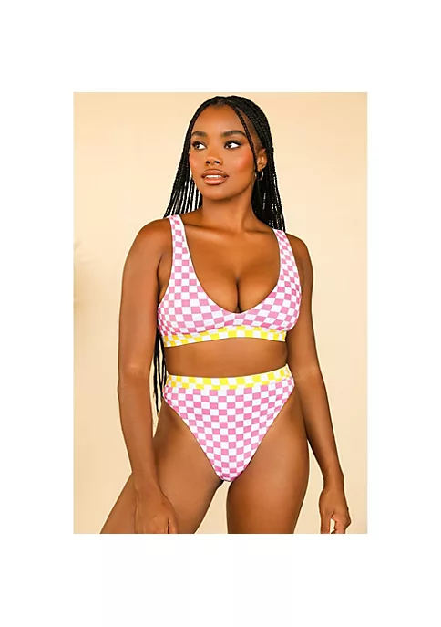 Lined. Low V-Neck Cut. Elastic Band. Checkered Print.