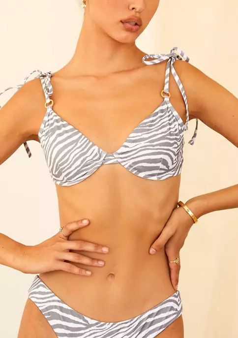 The Elise top features a scoop cup underwire top, accented with gold rings and tie straps for the perfect fit.