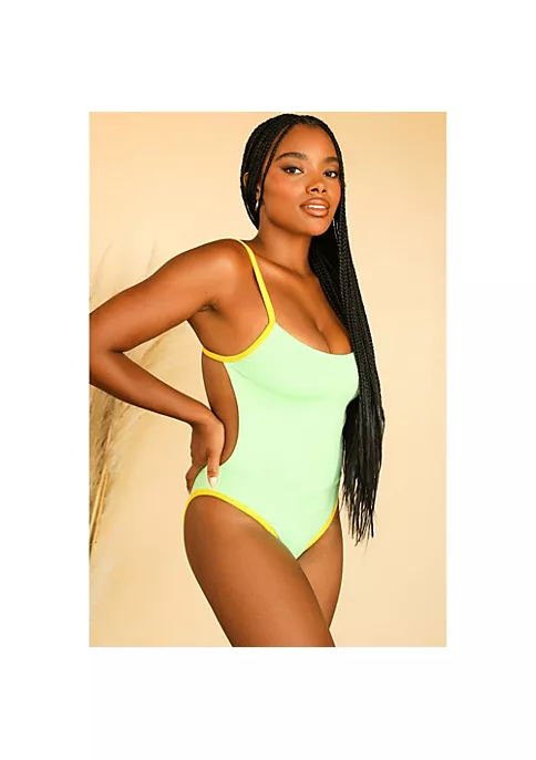 Lined. Scoop Neck. High Leg Cut. Moderate Coverage. Adjustable Straps. Open Back.