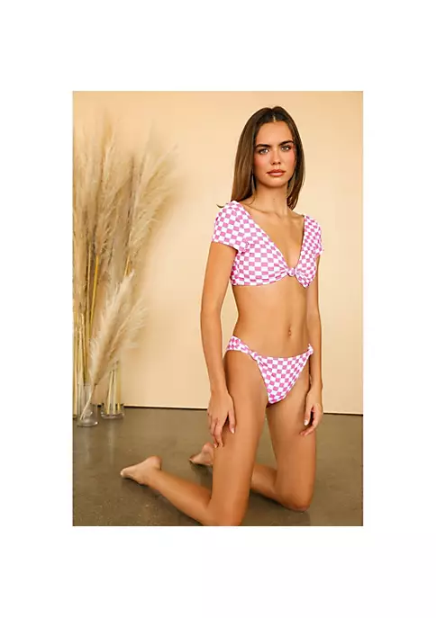 Triple Lined. Capped Sleeves. Straight Cut Back. Center Knot Tie. Checkered Print.