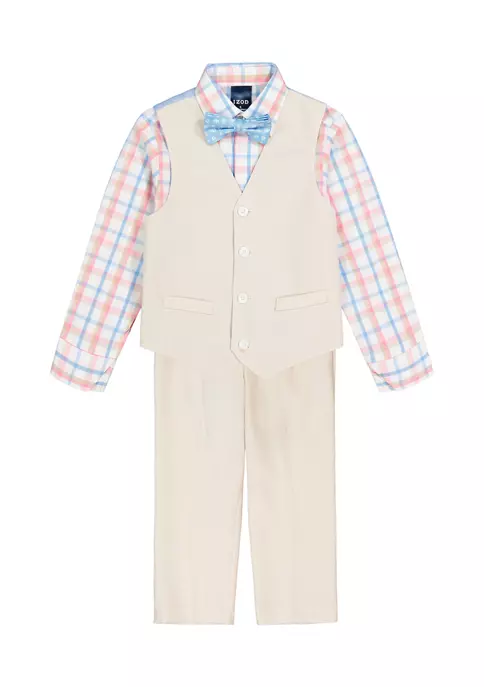 He’ll keep it dapper in this 3-piece khaki set from IZOD that features a vest, bow-tied shirt, and pants.