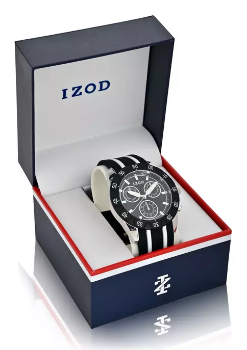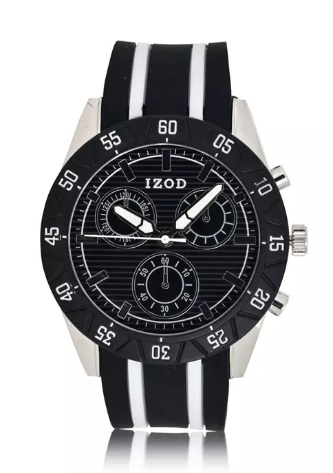 Black and White rubber strap, black faux chronograph dial, sport bezel, quartz movement, silver case