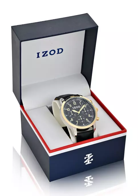 Men’s black strap, quartz movement, blue faux chronograph dial, round two tone case