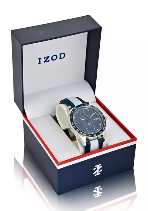 Men’s blue/gray strap, quartz movement, blue 3 faux sub dial, round silvertone case, sport bezel